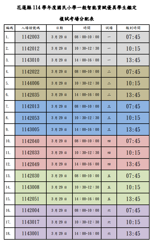 花蓮縣 114 學年度國小資優鑑定-複試試場通知